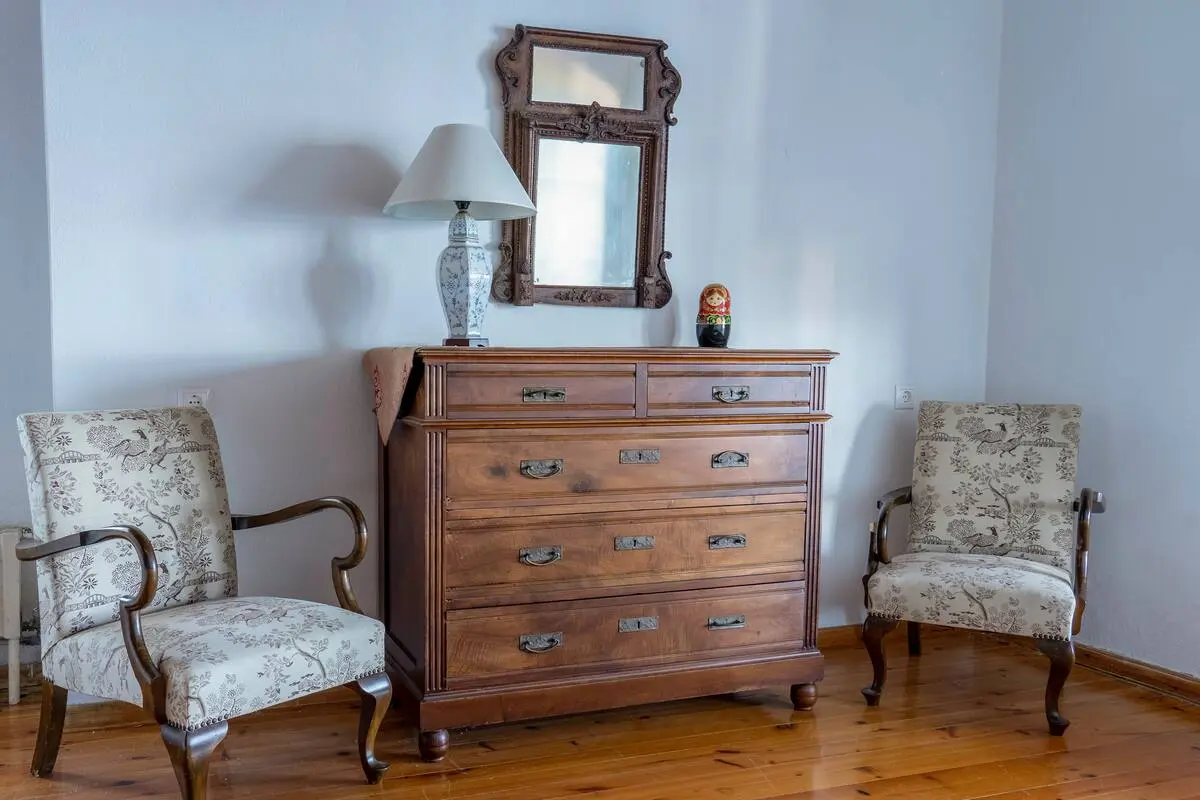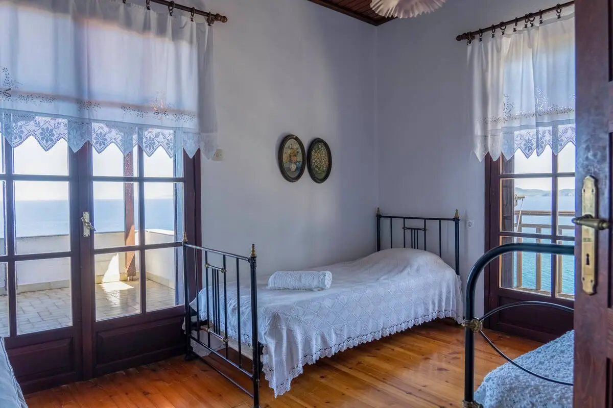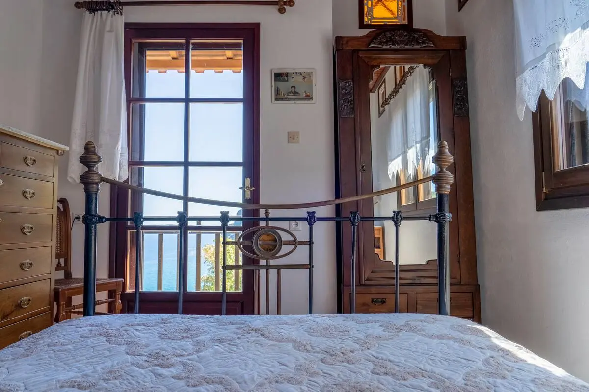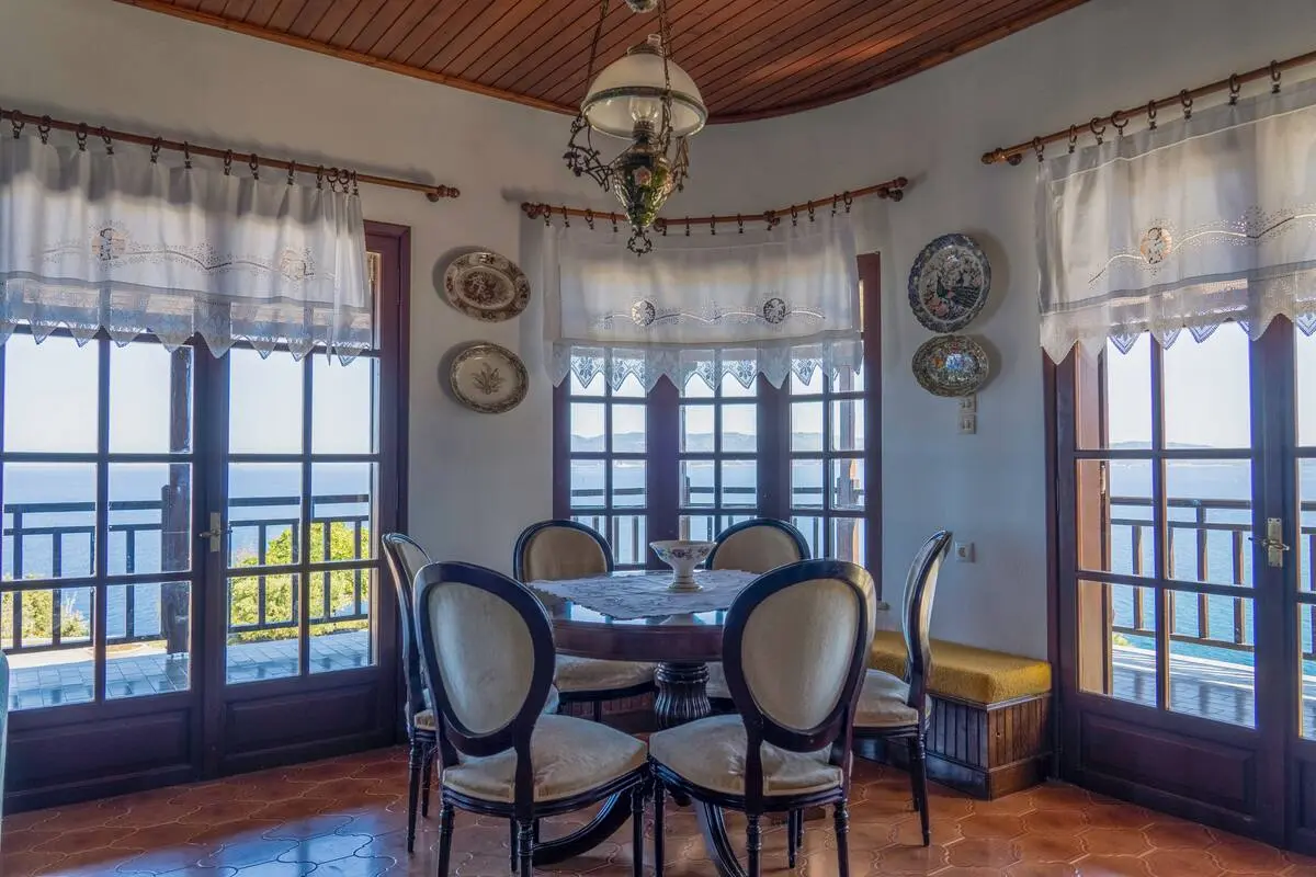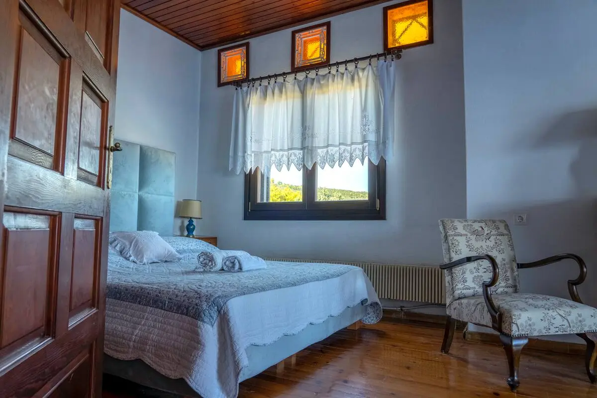 Step into a traditional Pelion home where stone walls, wooden ceilings, and hand-crafted details meet wide windows that frame the Aegean Sea.